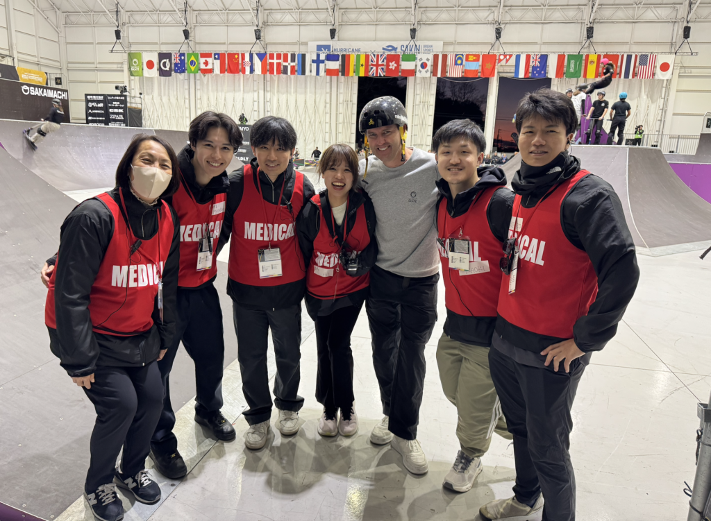 競技中は、高難度トリックや高速動作による外傷、打撲、裂傷に加え、脳震盪が疑われるケースなど、多岐にわたる傷病への対応が必要となり、対応件数も非常に多い大会となりました。